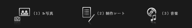 ご準備いただく素材は(1)お写真、(2)制作シート、(3)音楽CD、データの3点になります。